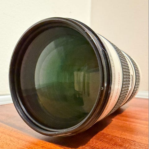 Canon EF 70-200mm f/4L USM telezoom objektiv. Objektivet, der er supervelholdt og velfungerende har en brændvidde på 70-200mm og en maksimal blænde på f/4 gennem hele zoomområdet. Det tilhører Canons L-serie og er beregnet til Canon EF-fatning. Velegnet til blandt andet portrætter, sport og naturfotografering. På billedet ses objektivet sammen med modlysblænde, frontdæksel og UV-filter som medfølger.