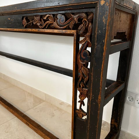 Ukendt mærke håndmalet konsolbord i træ med japansk inspireret motiv. Bordet er lakeret i guld med udskårne dekorationer på kanter og ben. Bordpladen er dekoreret med figurmotiver og blomster, mens nederste hylde har landskabsmotiv med bjerg. Velegnet som konsolbord i entré, stue eller som dekorativt sidebord. Materiale fremstår som malet og lakeret træ. Mål og yderligere specifikationer er ikke oplyst.