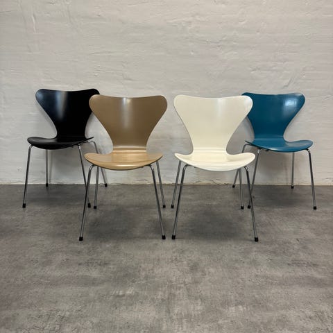 Ikoniske Serie 7 / 3107 stole designet af Arne Jacobsen og produceret hos Fritz Hansen.