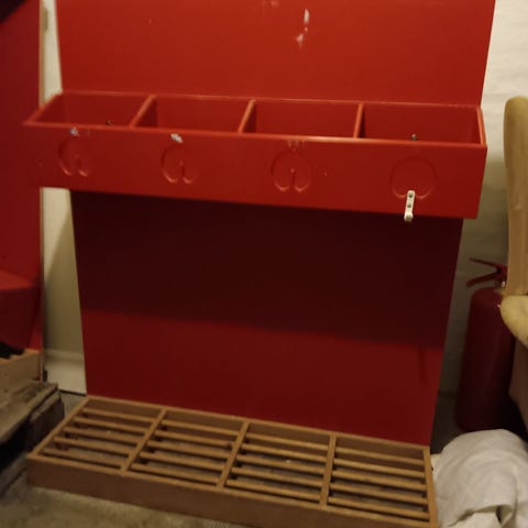 Komplet garderobe til væggen - skohylde med tre hylder. Knagerække med 8 knager mulighed for at sætte flere på, tre hylder, seks kurve følger med, lodret knagerække med fire knager.