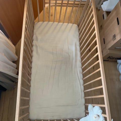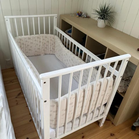 Højden på sengen kan justeres, så den passer til barnets alder. Sengen kommer med en Änglamark tremmesengsmadras, der er som ny og medfølger.