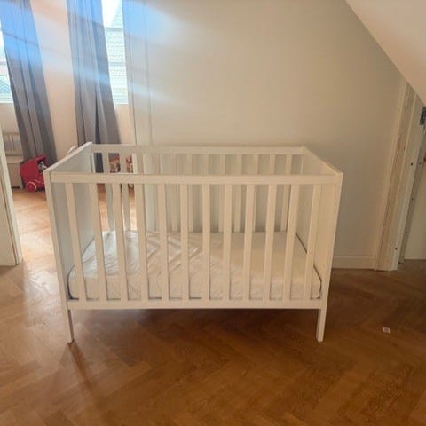 IKEA SUNDVIK tremmeseng i hvid. Klassisk tremmeseng med fast gavl i begge ender og tremmesider på langsiderne. Sengen har lamelbund i træ, som giver ventilation under madrassen. Velegnet som babyseng eller juniorseng i børneværelset.
