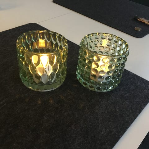 2 fyrfadsstager i kraftig glas. Kan også bruges til blomster. Ingen skader.