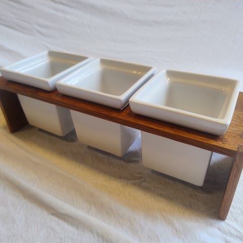 I massiv teak, med 4 hvide keramik krukker uden skår, og med de originale låg i teaktræ