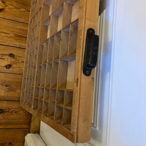 Original gammel sættekasse fra bogtrykkeri. Brugt til blytyper til skrifttypen Akzidenz-Grotesk. Flot patina og masser af små rum – perfekt til dekoration, samlinger eller som væghylde.