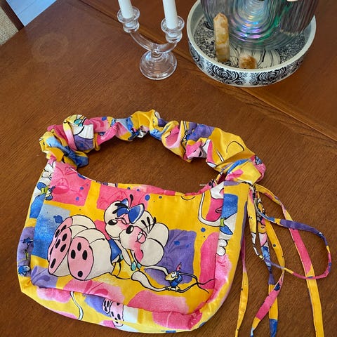 Upcycled Diddl mulepose/indkøbsnet taske, de er hjemme syet og designer af mig. Jeg har købt aflagte Diddl, hello kitty, Lego sengetøj sæt og upcycled dem til tasker! Både crossbody og 2 størrelser muleposer ✨ Tjek min profil ud for flere tasker