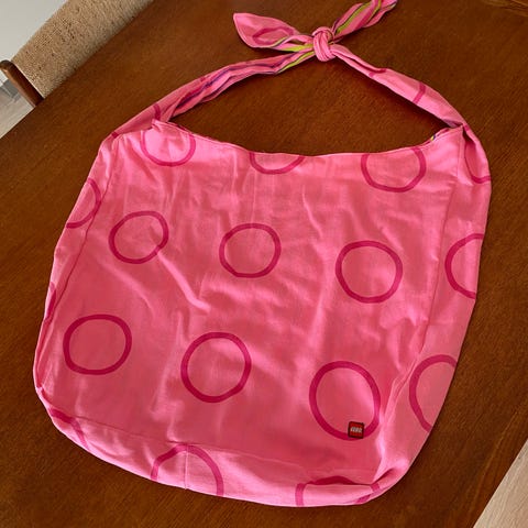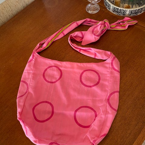 Tasken har en justerbar hank, så man kan binde sløjfen / knuden som man vil, til at få en lang crossbody hank eller en kort til at have på den ene skulder. Efter hvad man selv synes er bedst 😄 Samt så har de to sider og er vendbar, den ene side med mønster fra sengetøjet og den anden side med ensfarvet for! Så kan du vende den som du er i humør til ✨