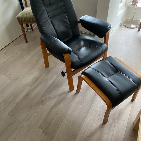 Otiumlænestol med fodskammel i brunt læder uden skader men med udtryk af brugt læder “patina” Fantastisk støtte og hvilestol med stor siddekomfort. Ved evt. handel er afhentning bedst søndag d. 8 marts kl. 10-12. Ellers kan anden dag aftales. Pris 225,- kr.