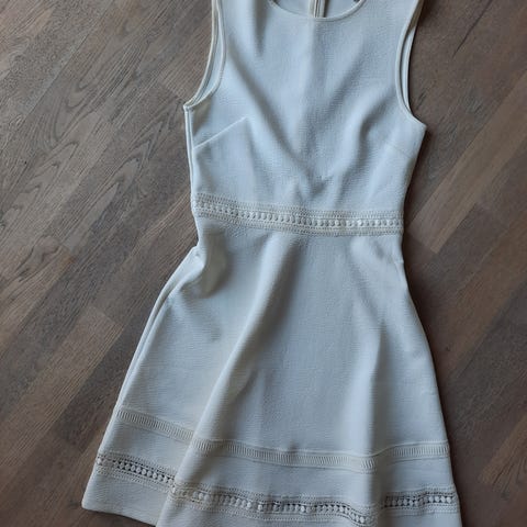 H&M fest/cocktailkjole i størrelse XS. Modellen er ærmeløs med rund hals og har skørt med let vidde. Der er dekorative bånd med hulmønsterdetaljer i taljen og nederst på skørtet. Velegnet til festlige anledninger og andre lejligheder, hvor en enkel, mørk kjole ønskes.