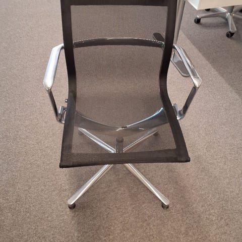 Stolen er monteret på en stabil firestjernet drejebase i aluminium, som giver god bevægelsesfrihed og et eksklusivt, professionelt udtryk. Kombinationen af det luftige ryglæn, den komfortable polstring og den solide base gør stolen ideel til moderne kontorindretninger, hvor fleksibilitet og design spiller en vigtig rolle.