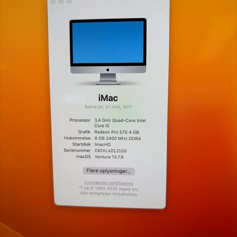 Apple iMac 27" stationær computer med indbygget Retina-skærm på 27" (2560 x 2880). Kører macOS Big Sur. Oplysninger fra skærmbillederne viser, at modellen er en iMac 27" (slut 2014) med Intel-processor og 8 GB RAM fordelt på to moduler á 4 GB. Velegnet som alt-i-én stationær computer til generelle kontoropgaver, internetbrug og multimedie. Skærmen er integreret i kabinettet,