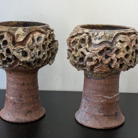 Signeret lysestage til bloklys eller fadlys, af Bodil Marie Nielsen, dansk studiokeramik ca. 1970, brutalistisk organisk glasur. 5cm høj og 16 cm bred. I fin stand.