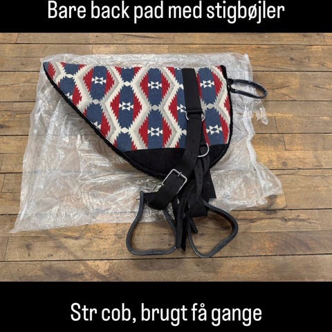 Bareback pad ridepude i sort med lys kant i str cob. Puden er formet til hestens ryg og har stropper til fastgørelse. Velegnet til ridning uden traditionel sadel for tættere kontakt med hesten. Kan bruges til daglig træning eller turridning. Brugt få gange