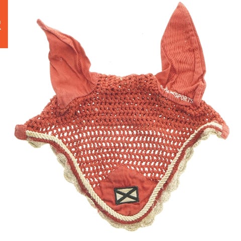 En hestehætte med to spidse ører, designet til at beskytte hestens hoved mod insekter og støv. Materialet er en kombination af tæt stof og net, der sikrer ventilation. Hætten er overvejende grå og har en label på forsiden. Størrelsen er 30x32 cm.
