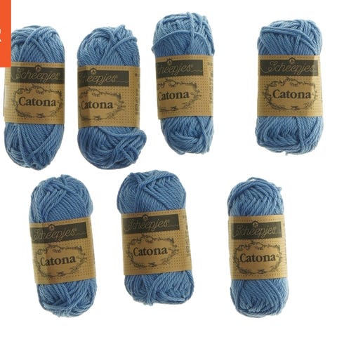 Dette er et sæt af 8 nøgler Scheepjes Catona garn i en blå farve. Hver nøgle har en længde på 25 meter. Garnet er ideelt til strikke- eller hækleprojekter.