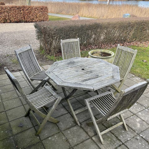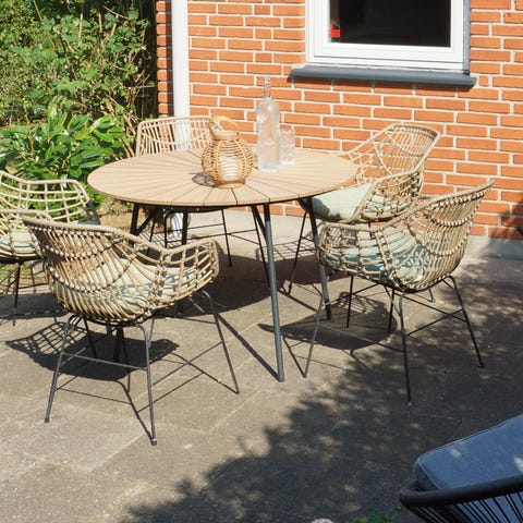 Havesæt med 6 stole,sæde og ryghynder. Bordet er 150cm diameter.