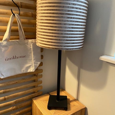 Tine K pendel med plisseret lampeskærm. Designet til loftophæng med stofledning og standard fatning til pære. Skærmen er plisseret med hvid og grå striber og giver et blødt, diffust lys, velegnet over spisebord, i stue eller køkken.