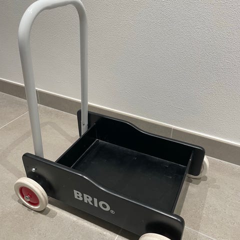BRIO gåvogn i rødmalet træ med hvid bundplade. Vognen har fire hjul med lyse dæk og sort fælg samt sort metalbøjle som håndtag. Egnet som støtte til små børn, der øver sig i at gå, og til leg med transport af legetøj.