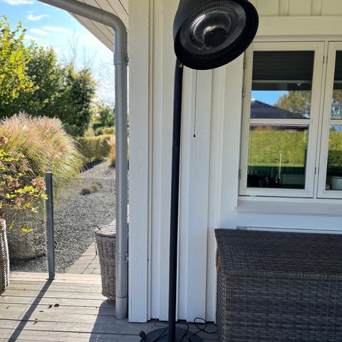 Mensa Heating Imus terrassevarmer. Dette er en fritstående, infrarød varmer, der er designet i Danmark og specifikt udviklet til at stå under et havebord for at holde benene varme.