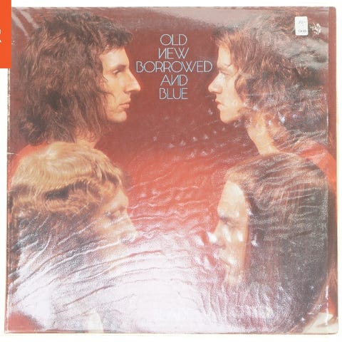 Dette er en vinylplade af Slade med titlen 'Old New Borrowed and Blue'. For- og bagsiden af pladecoveret viser portrætter og listen over sange inkluderet på albummet. Sange som 'Just Want A Little Bit', 'Find Yourself a Rainbow' og 'Good Time Gals' er blandt titlerne. Pladen er udgivet under Polydor Records og produceret af Chas Chandler. Den indeholder en liste over musikere samt andre medvirkende i produktionen.