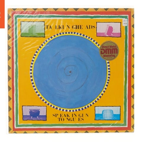 Vinylpladecoveret for Talking Heads’ album 'Little Creatures'. Forsiden har en unik kunstnerisk illustration med titel og tematiske elementer, mens bagsiden viser medlemmer af bandet klædt i farverige outfits. Albummet indeholder numre som 'And She Was' og 'Creatures of Love'. Udgivet i 1985.