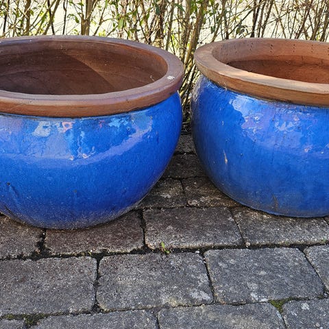 Blå keramik krukker til beplantning i have, på terrasse eller altan. Krukkerne har en blank glasur og er velegnede til blomster, mindre buske eller dekorative planter. De kan bruges enkeltvis eller som sæt og placeres direkte på fliser eller andet.