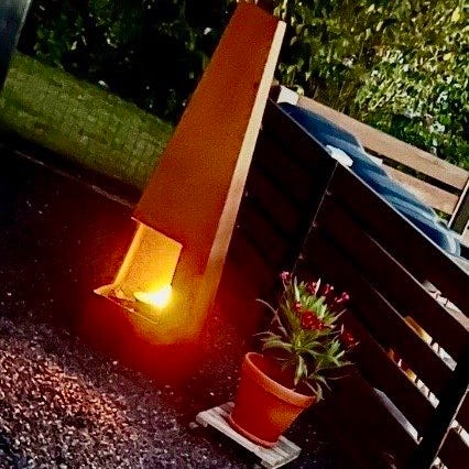 Udendørs pejs i støbejern. Pejsen har en lukket, rund brændeovn nederst med åbning foran og høj skorsten foroven. Velegnet til brug i have eller på terrasse til optænding med brænde og som varmekilde eller stemningsskaber udendørs.
