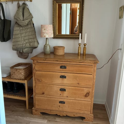 Kommode i fyrretræ/krydsfiner. Den er meget let, men stabil og god.