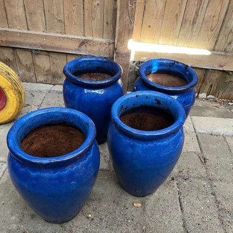 Blå keramikkrukker til udendørs eller indendørs brug. Krukkerne er glaseret i en klar blå farve udvendigt og har naturfarvet inderside og kant. Egnede til beplantning på terrasse, altan eller i have. En af krukkerne har synlige revner, som kan have betydning for holdbarheden ved brug med jord og vand.