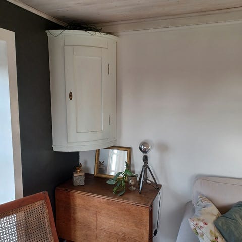 Smukt malet hjørneskab. Afhentes af køber, og nedbæres fra 1. sal.