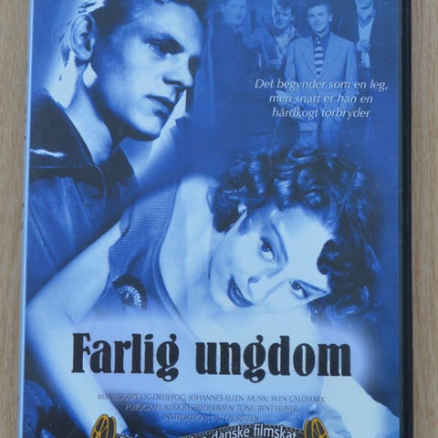 Farlig ungdom dvd film. Dansk spillefilm udgivet på dvd i standard plastcover. Forsiden viser skuespillerne og filmens titel, og bagsiden indeholder kort handlingsbeskrivelse samt tekniske oplysninger om filmen. Disken ligger i originalt etui med trykt motiv på dvd’en.