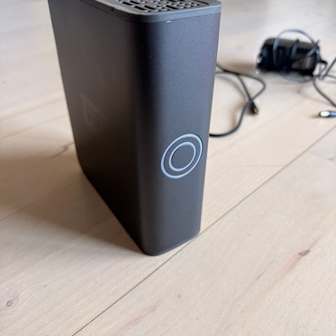 WD ekstern harddisk med kapacitet på 1 TB. Harddisken tilsluttes via USB og leveres med strømforsyning og kabler som vist på billederne. Kabinettet er i sort plast med ventilationshuller i siderne. Velegnet som ekstra lagerplads eller backup-løsning til computer eller andre enheder med USB-tilslutning.