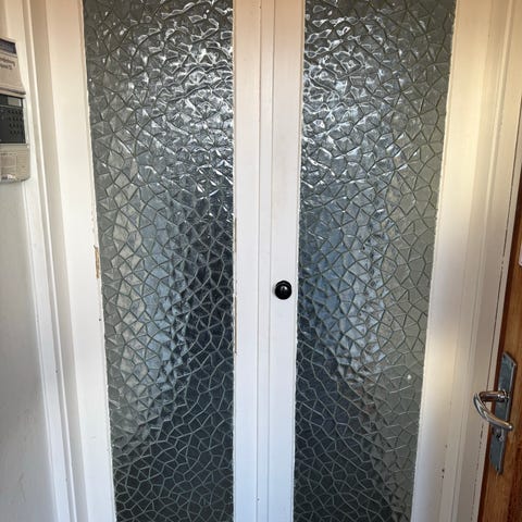 Dobbeltdør med store glasfelter og hvid ramme. Fra 2003 Døren består af to fløje med glas, som giver godt lysindfald. Egnet som udvendig dør, mål B 205 cm H 207 cm 3 stk haves 500kr stk