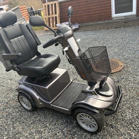 Invacare Orion el-scooter i sølvfarve. Modellen har fire hjul, sort sæde med armlæn og nakkestøtte samt kurv foran til opbevaring. Scooterens stel og skærme er i sølv, og der er fodplade med skridsikkert underlag. Velegnet som elektrisk køretøj til persontransport over kortere afstande, f.eks. til indkøb og daglige ærinder.