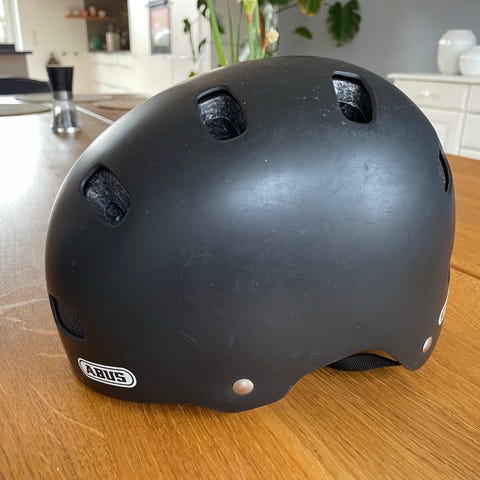 Abus cykelhjelm i mat sort farve. Hjelmen har flere ventilationsåbninger for luftcirkulation og justerbart spændesystem i nakken for bedre pasform. Str. Large. Aldrig brugt og stadig i oprindelig emballage