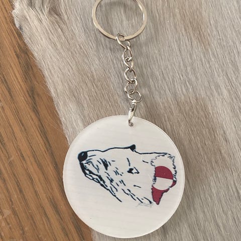 Holografisk tryk af Isbjørnehoved med Grønlandsk flag på halsen på gylden rund Broche med nål Ø: 2,5 Cm.