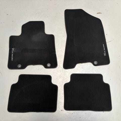 Hyundai Tucson PHEV 2021 gulvmåtter i velour. Sættet består af fire måtter til venstrestyret bil. Måtterne er formskåret til model Tucson PHEV og har modelbetegnelse trykt på. Fremstillet i velourmateriale med skridsikker bagside, egnet som originale bundmåtter til kabinen.