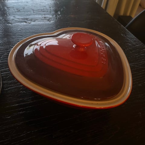 Smuk udgået model af Le Cruset ovnfast fad i hjerteform med låg.
