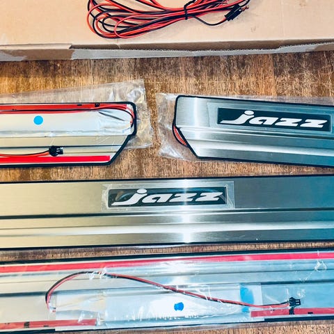 Mazda logo med lys...2 sæt der skal sidde i dørtrin med lys som kan lyse i forskellige farver og på forskellige måder...de 2 andre sæt.. de 2 små sorte boxe lyser med mazda logo ned på jorden når du åbner døren.