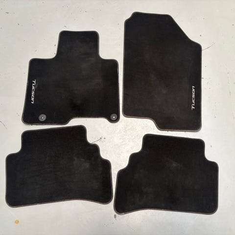 Hyundai Tucson 2018 bilmåtter i tekstil til venstrestyret bil . Sæt med fire sorte gulvmåtter, fremstillet i tekstilmateriale (PAS). Originale Hyundai-måtter egnet til montering i kabinen på Hyundai Tucson, med udskæringer og fastgørelsespunkter tilpasset modellen.
