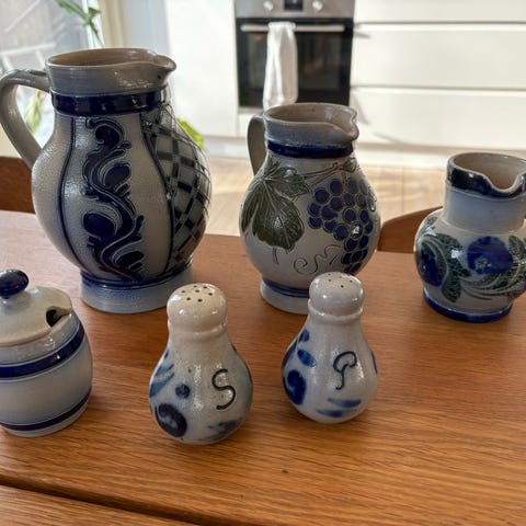 Keramik sæt bestående af to kander, en skål og en beholder med hank. Delene er i cremefarvet glasur med dekorerede mønstre og blomster i mørke og varme nuancer. Sættet kan anvendes i køkkenet eller som dekoration, eksempelvis til servering, opbevaring eller som pyntegenstande på bord eller hylde.
