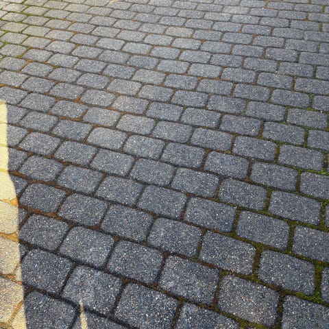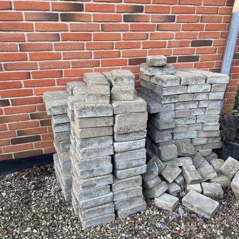 Grå beton herregårdssten netop taget op i vores indkørsel. Stenene er stablet på palle og der kan bakkes helt op til med trailer. Ca 15m2 gætter jeg på