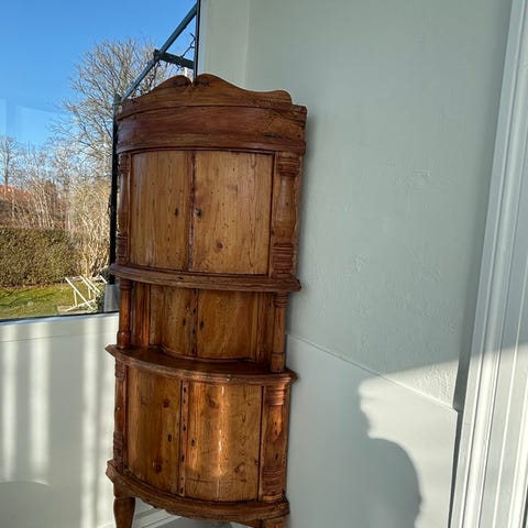 Flot og dekorativ hjørne-hængevitrine i massivt træ med sprosset glaslåge. Perfekt til at udnytte pladsen i et hjørne og skabe en hyggelig, klassisk stemning i rummet.