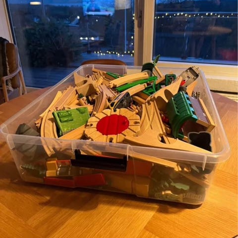 Kæmpe kasse med masser af togbane og toge i.