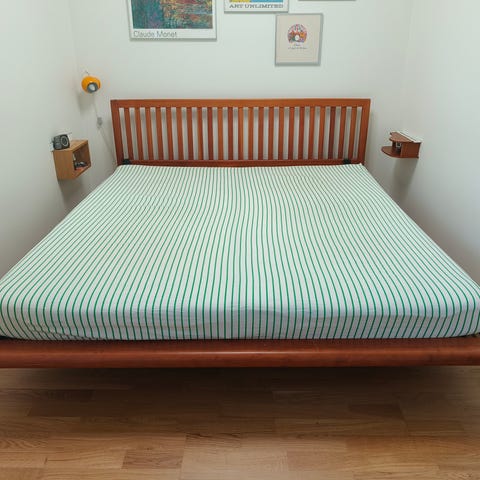 Seng med hovedgavl og madras i mørk træramme. Sengen har en enkel, rektangulær hovedgavl og ben i samme materiale som rammen. Madrassen er hel og dækkes af en topmadras. Dobbeltseng i soveværelse eller gæsteværelse. Rammen står på fire ben, hvilket giver plads under sengen til opbevaring afhængigt af højde på benene.