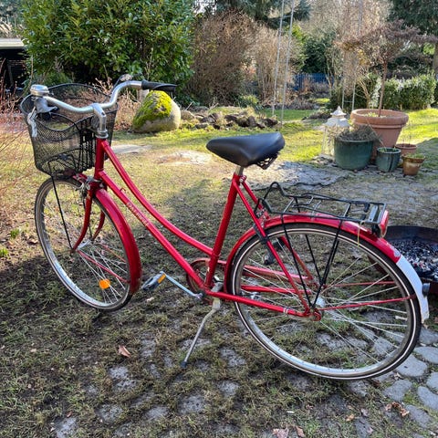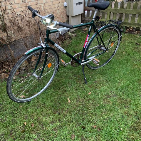 Raleigh bycykel med 28" hjul i sort. Cyklen har klassisk stel med lav indstigning, bagagebærer, kædeskærm og skærme for og bag. Velegnet til daglig transport i byen.
