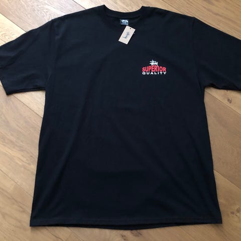 MT-shirt til herre i størrelse S. T-shirten er hvid og fremstillet i bomuld. Den har rund hals og kortærmet design. På brystet er der et lille Stüssy-logo, og på ryggen et stort Stüssy-logo i kontrastfarve. Velegnet som hverdags-T-shirt eller til afslappet brug.