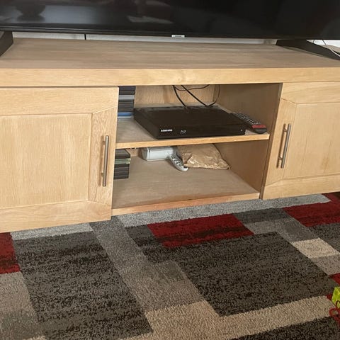 Flot gedigen tv-bord / reol i egetræ. Fine detaljer og udskæringer. Vi har ben i forskellige længder.