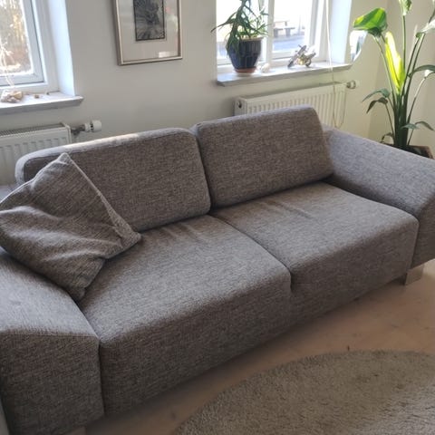 Sofa med synlige mærker, da den har stået i udestue med svingende temperaturer. Bør have et stykke stof over. Fejler ellers ikke noget. Stoffet medfølger ikke umiddelbart. Bordet sælges separat for 100 kr. Står i Korsør