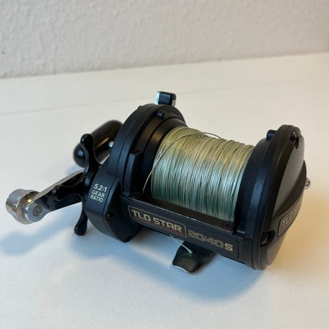 Super solidt Shimano TLD 2-speed 20 i rigtig god stand. Virker perfekt. Gearing 4,0:1/1,7:1. Monteret med ca 370m fletline omkring 0,45-0,50mm, der skifter farve for hver 10 meter. Kun ganske få ubetydelige brugsspor. Se billeder.